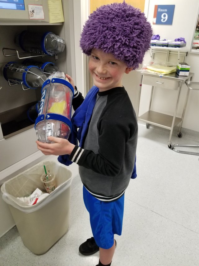Thanks to one of Adam’s coworkers, Eli has a regular supply of candy, some of which he brought to his clinic appointment today (notice the boxes on his head and hands). When the nurse let Eli send his labs, Eli decided to share his candy with the people in the lab. He also wrote them a note.