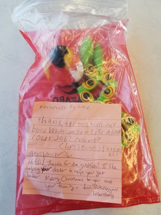 After meeting with the radiation oncologist, I had Adam drop us off at the other hospital for Eli’s clinic appointment. Eli prepared a note for the pathologists in advance to send with his blood to pathology. He also included a small bag of goldfish crackers. This is what pathology sent in return:
