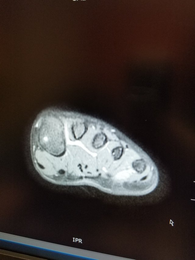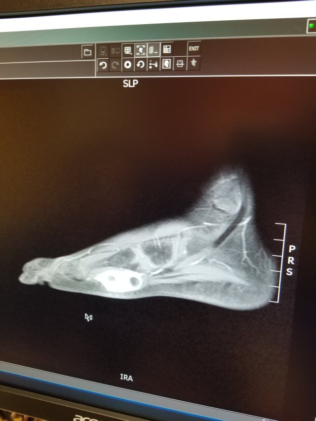 The white blob between the 4th & 5th metatarsals is the tumor. Chemo has done a good job of shrinking it. Yay!