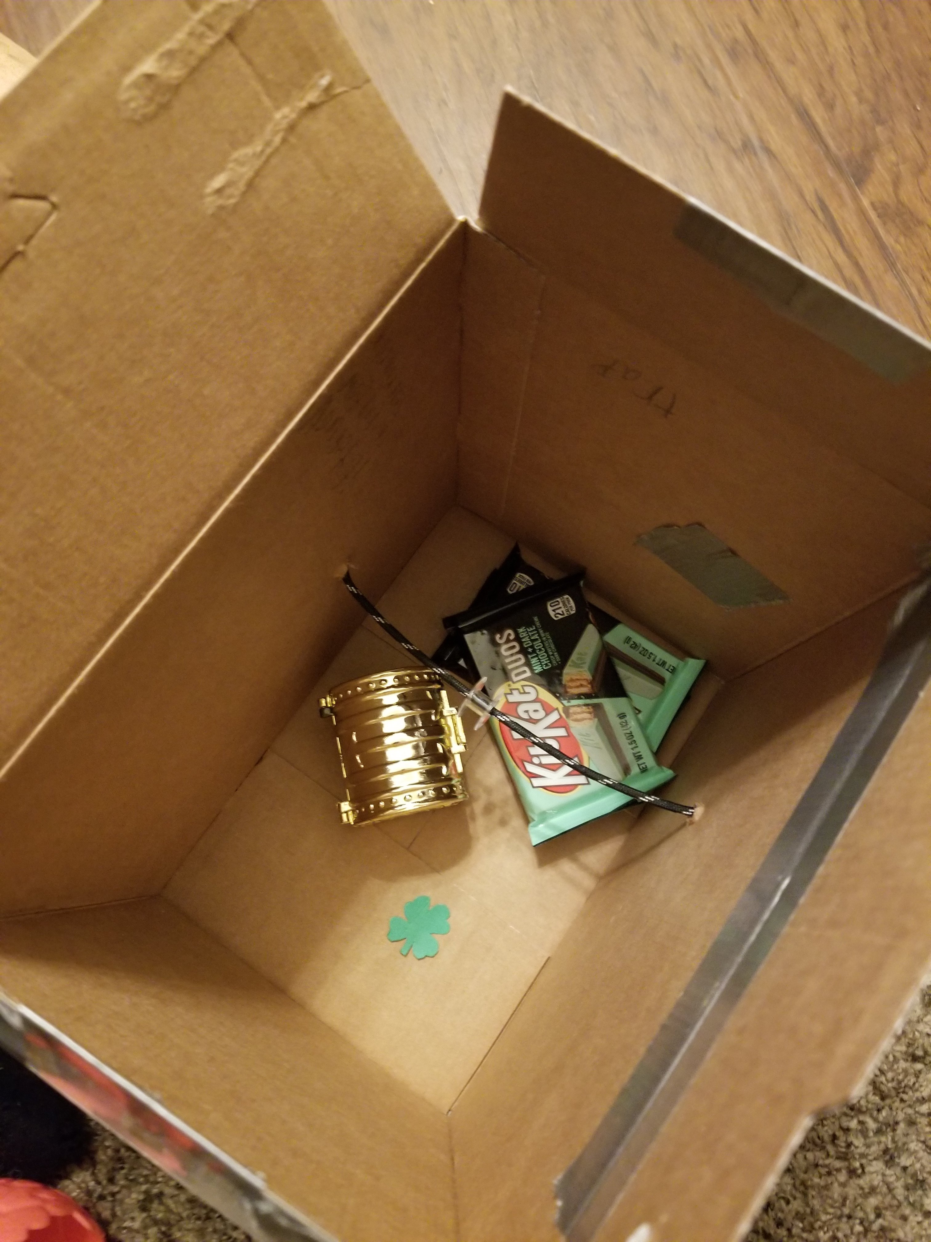 The kids like to try and catch Leprechauns each year on St. Patrick’s Day. This year, they set out the traps they worked on earlier today. This is what they came up with: