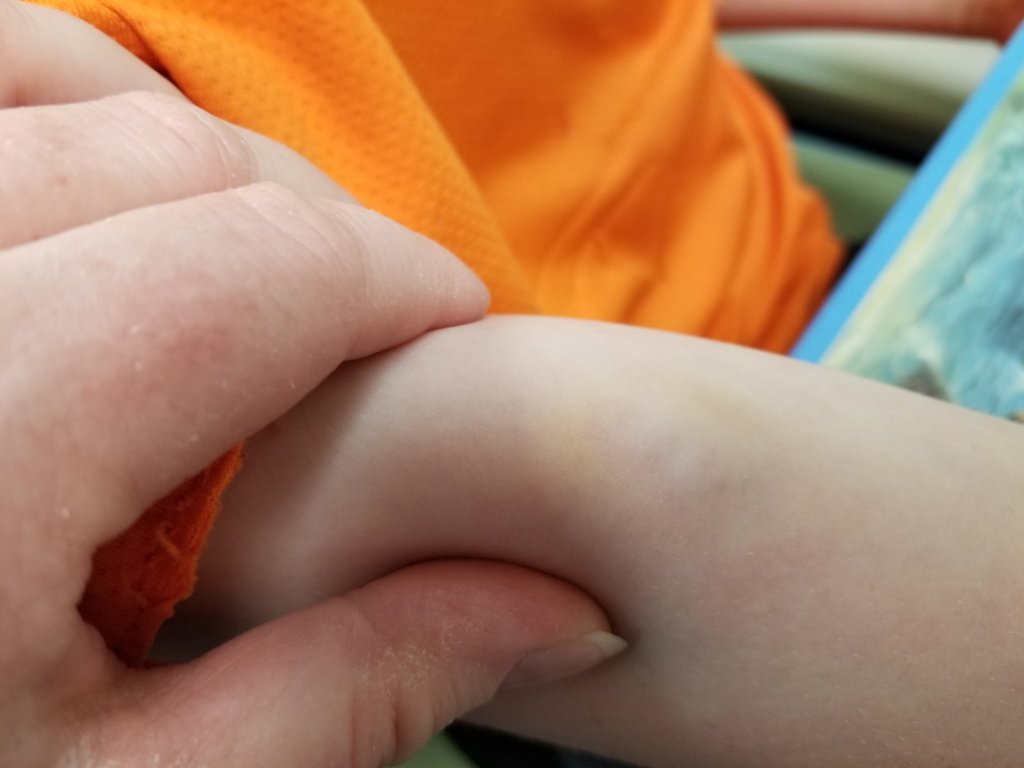 Now there is a new mass in Eli’s right bicep. It was discovered Saturday night, May 16th, when Eli was trying to climb into his bunkbed, but slipped a little and bumped the mass against the railing. Sunday, it was swollen. Monday, the swelling had subsided, but the mass was still there.