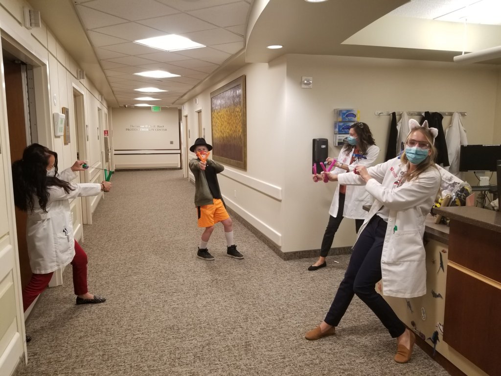 Eli finished the last scheduled radiation of this round and the techs were so kind and shot him with sling shots and showered him with thoughtful gifts.