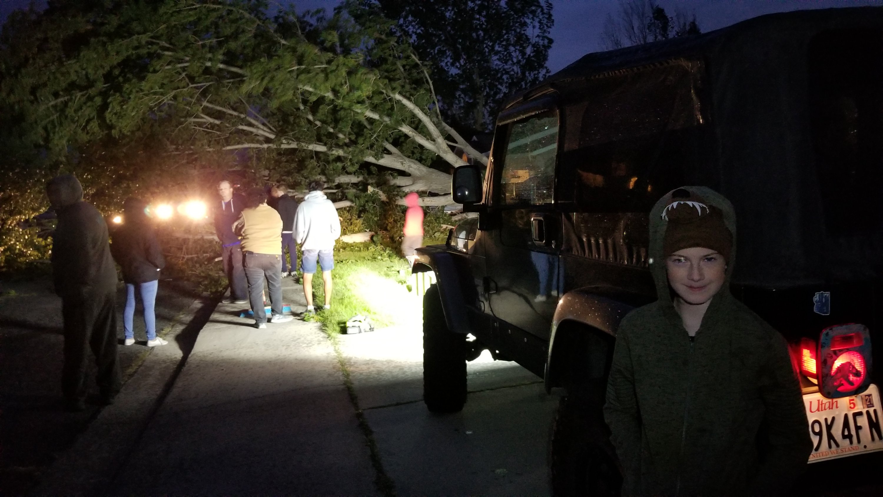 Another day there was a storm that led to a power outage and a fallen tree on the street below our house. Eli wanted to join the clean up crew, so he sat on the sidewalk watching for danger.