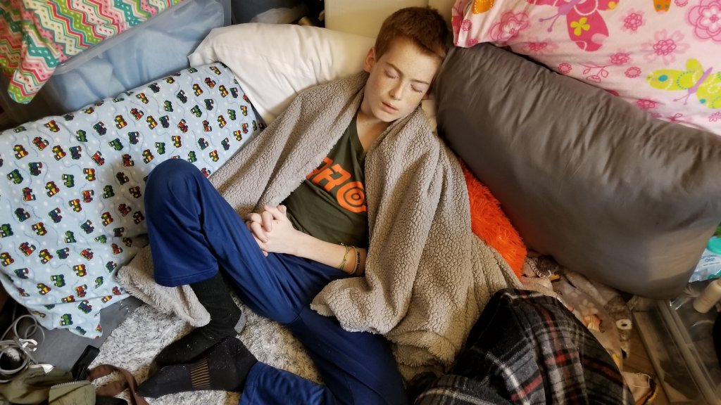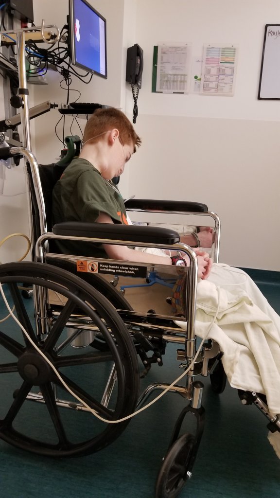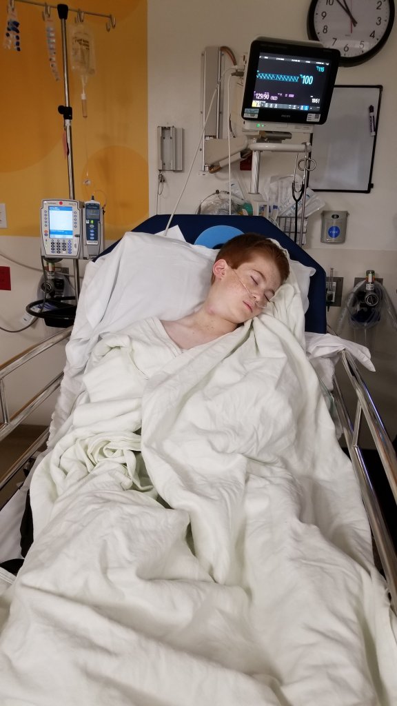 Saturday, October 23rd: Eli’s procedure is over and we are back in his room recovering and waiting for discharge from the hospital. He’s more awake and he’s hungry. Good thing I brought all of his favorite food options with us to the hospital–this is a Mom Win moment. While eating the spaghetti his cousin Rebecca made (thanks Becca!), I am reading a book to him from his favorite author Brandon Sanderson. Listening to his audiobooks has been a lifesaver throughout the last three years and numerous procedures, clinic visits, and hospital stays.
