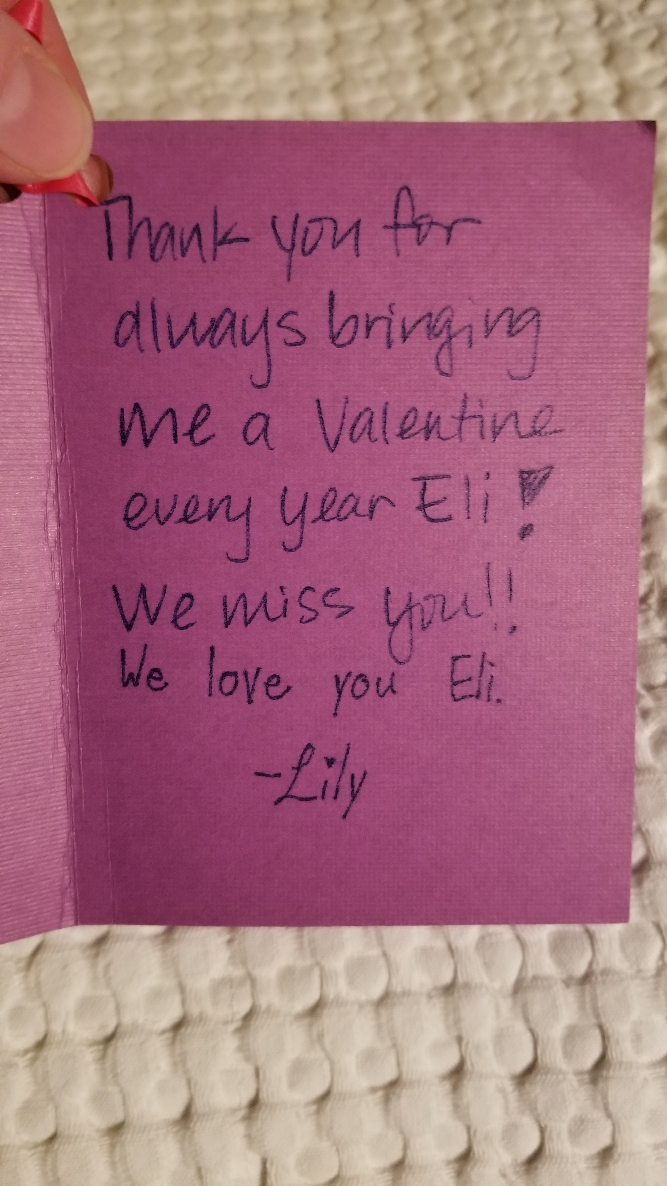 On Valentine’s Day, my friends had sent me pictures of their kids bringing Valentines to Eli.